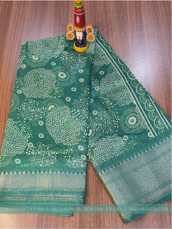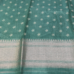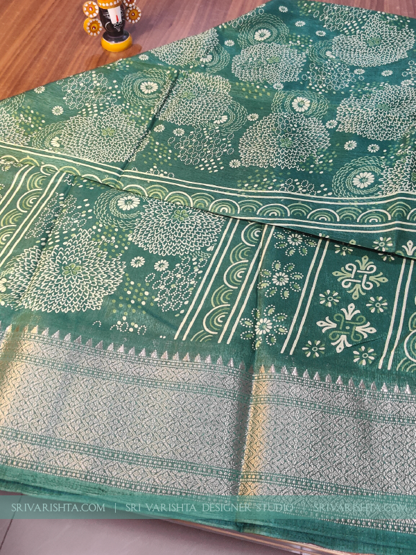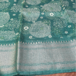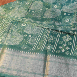 The intricate digital prints add a modern artistic flair, while the shimmering zari border enhances the saree’s regal charm. Lightweight yet opulent, this saree seamlessly blends traditional craftsmanship with contemporary aesthetics. Pair it with a matching blouse and statement accessories for a standout look.