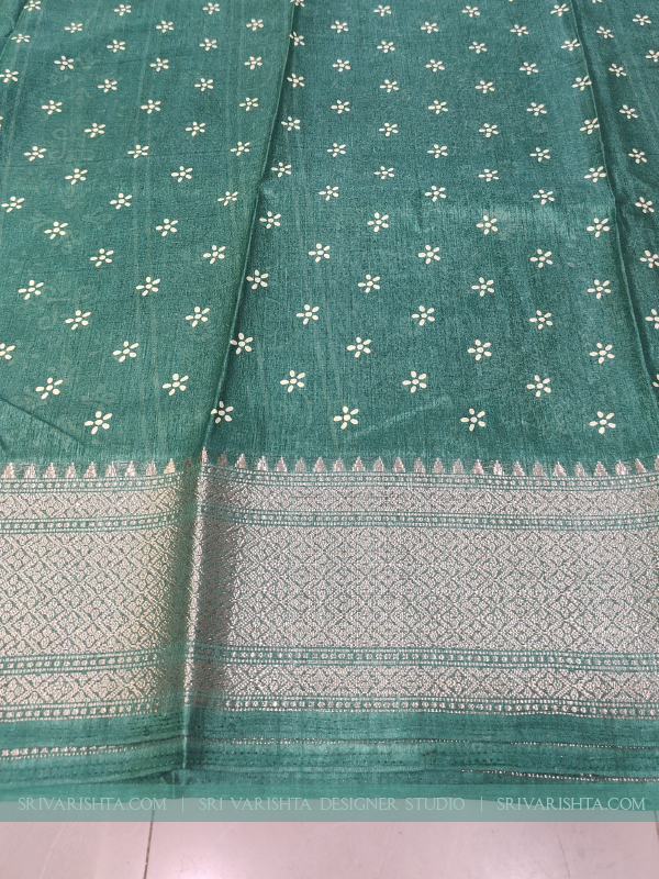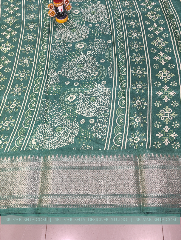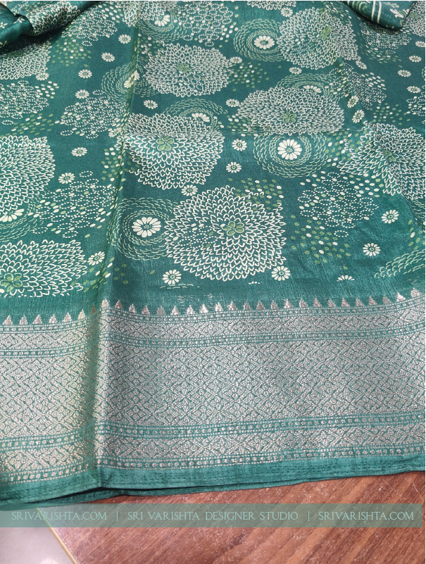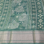 + Free ShippingStep into elegance with this exquisite Dola silk saree, designed in a Leaf Green and adorned with vibrant digital prints. The luxurious Dola silk fabric offers a soft and smooth texture, ensuring a graceful drape that makes it perfect for weddings, festive occasions and evening gatherings.