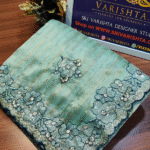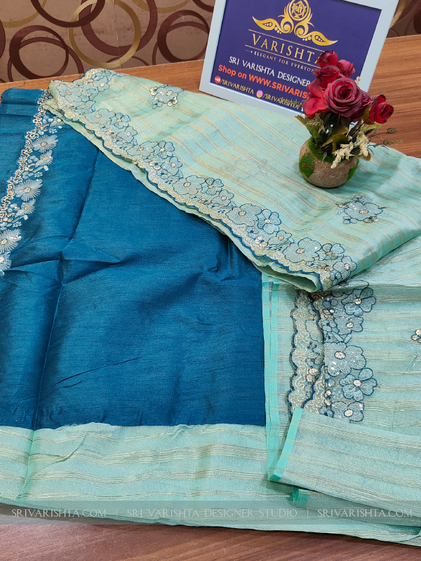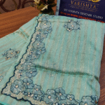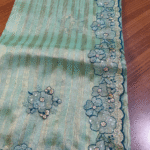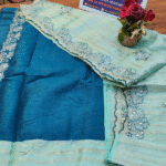 Elevate your style with this luxurious aqua green saree, featuring intricate floral embroidery in a “Scallop” Border. Crafted to perfection, this saree blends timeless elegance with a modern touch, making it an ideal choice for weddings, parties and festive occasions.