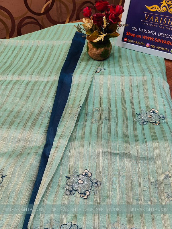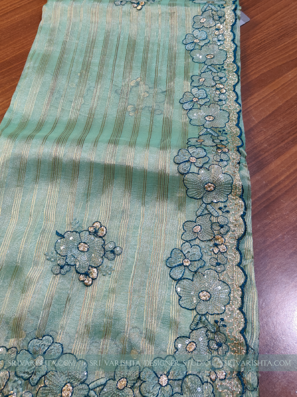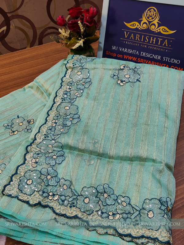 Floral embroidery Jimmy choo Aqua Green saree with Scallop Border
