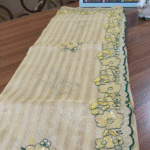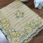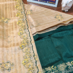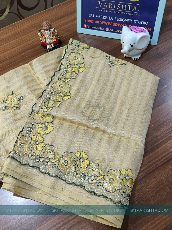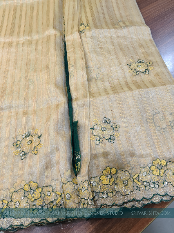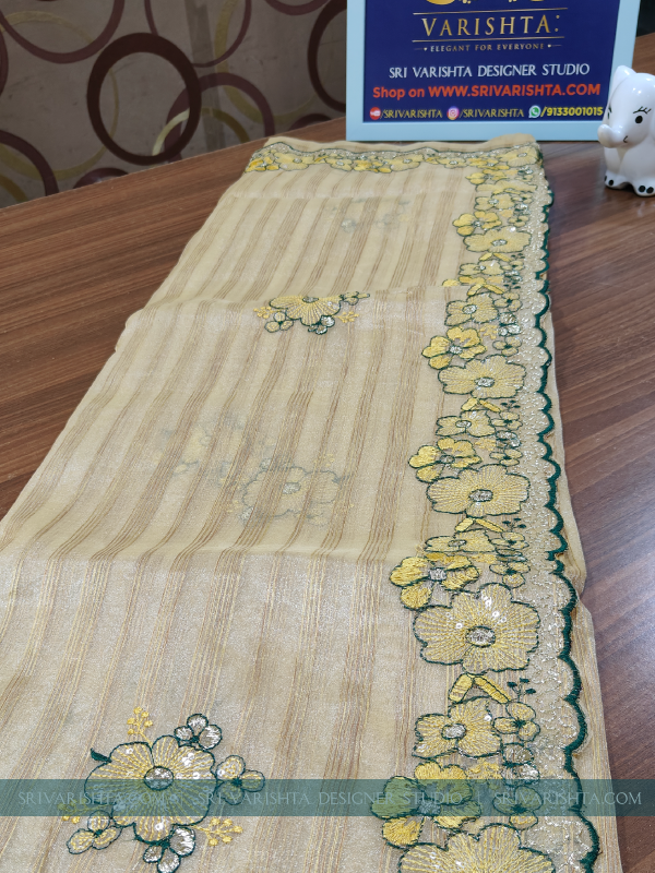 Floral embroidery Jimmy choo Golden Beige saree with Scallop Border