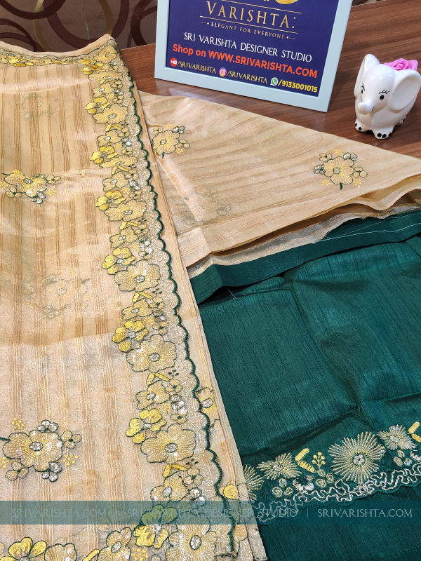 + Free ShippingElevate your style with this luxurious golden beige saree, featuring intricate floral embroidery in a “Scallop” Border. Crafted to perfection, this saree blends timeless elegance with a modern touch, making it an ideal choice for weddings, parties and festive occasions.